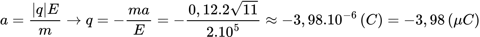 Con lắc đơn gồm vật nặng, khối lượng m = 120(g), mang điện tích q < 0 được treo bằng một sợi dây mảnh có chiều dài l = 120(cm), trong một điện trường đều có phương ngang, có cường độ thì con lắc dao động nhỏ với chu kỳ 2 s. Lấy . Điện tích q bằng