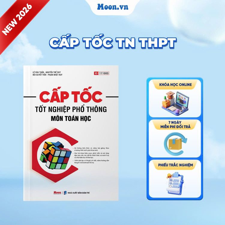 Cấp Tốc Tốt Nghiệp Phổ Thông Môn Toán Học tổng hợp hơn 1.000 bài toán điển hình, bao quát toàn bộ kiến thức Toán học cần thiết cho kỳ thi Tốt nghiệp THPT, được phân loại rõ ràng theo từng chủ đề, tăng dần theo mức độ từ cơ bản đến nâng cao, bám sát 3 dạng thức đề thi mới nhất của Bộ GD&ĐT: trắc nghiệm 4 phương án, đúng/sai, điền đáp án, giúp em không bị bất ngờ khi đọc đề. Đặc biệt, mỗi bài tập trong sách đều có đáp án chi tiết, tra cứu tiện lợi qua mã ID trên website/app Moon.vn.